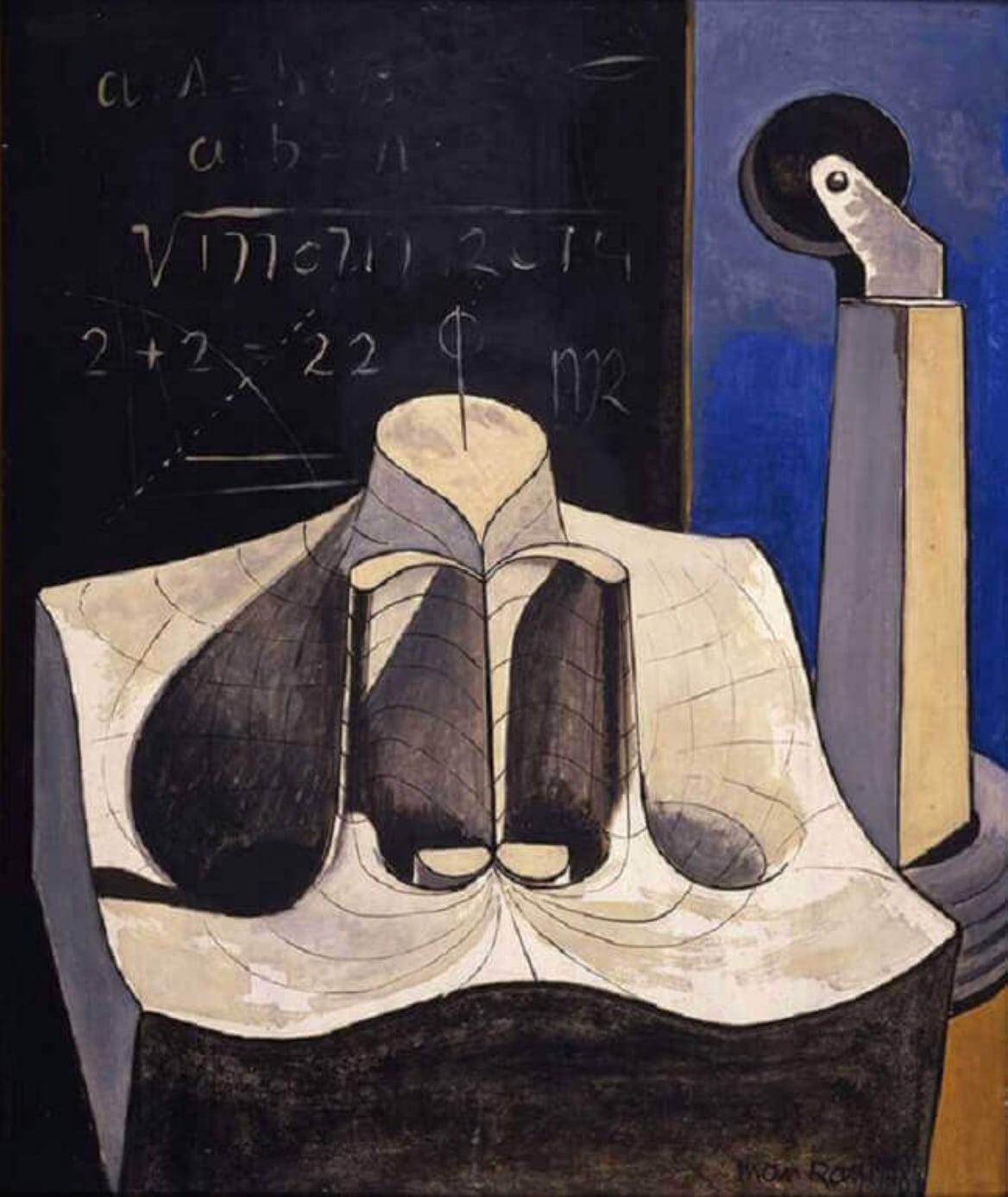 Man Ray was forced to return to the United States by World War Two; he settled in Los Angeles and focused on painting. It was at this time that the artist married his second wife Juliet Browner, in a double ceremony with Duchamp and Surrealist artist Dorothea Tanning. In 1948, Man Ray exhibited his new series of paintings Shakespearian Equations in Los Angeles. The paintings, the titles of which refer to Shakespeare’s plays and characters, are based on a series of mathematical models from the Institut Henri Poincaré in Paris. Surrealist Max Ernst had introduced these objects to Man Ray who photographed them in the mid 1930s. At the time, he was probably just documenting them as curious objects, a practice of many Dada and Surrealist artists. A decade later he incorporated the peculiar shapes into the Shakespearean Equations paintings. Man Ray had no understanding of the complex mathematical formulas the models represent and in Julius Caesar, he explicitly defies the logic of math with the nonsensical equation 2 + 2 = 22 on the blackboard in the background. By taking the strangely shaped object making it the “main character” in this painting, Man Ray is using a popular Surrealist trope, humanizing an inanimate object. (See Chance Encounters 26 and subsequent editions celebrating last year’s centennial of Surrealism for the movement’s philosophy and practices.) The artist returned to Paris in 1951 where he continued his diverse production, sometimes reworking old works in new ways, and overseeing the replication of early works which had disappeared or were in demand.