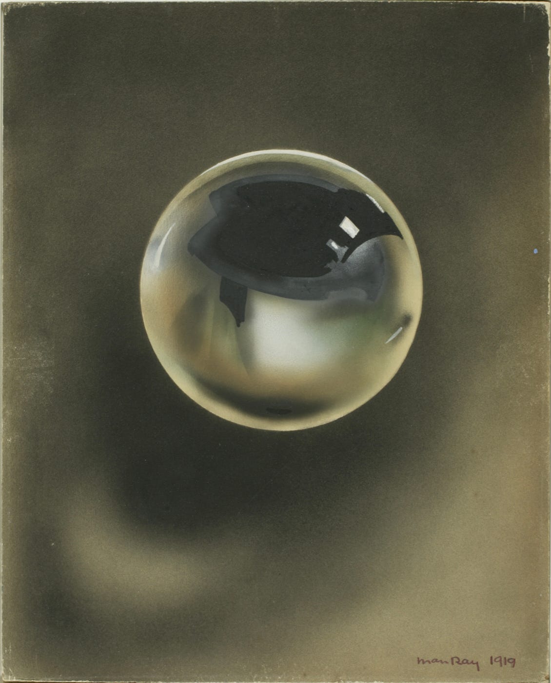 In 1919, Man Ray began to explore new, often mechanical means of creation as he became more involved with the philosophies of the Dada movement. Dada was an international movement which began in the face of World War One first in Switzerland, spreading throughout Europe, as well as to Asia and the United States. The young artists of Dada wished to overthrow tradition in all aspects of society. Mechanical artmaking suited the Dada rejection of conventional behavior. In painting, Man Ray turned to airbrushing as a means of applying paint. He dubbed such works “aerographs.” Though The Eye That Sees Everything (1919) was not made using only airbrush, it shows the artist’s experience with his new technique in the misty background. In contrast, the solidity of the central orb looks almost photographic, a reminder that Man Ray was beginning to develop his skills in that medium during this period as well.
