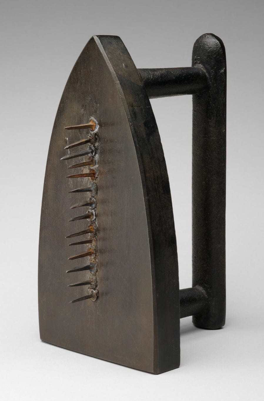 Following the lead of his friend Duchamp and his “readymades,” Man Ray began to create works from found objects. Unlike Duchamp who limited alterations to the original manufactured goods, Man Ray mixed materials together to create thought-provoking results. Gift, which was first produced in 1921, consists of 14 iron tacks glued to the flat surface of a flat iron, which would be set on a stove to heat before pressing clothes. The work is an example of Dada playfulness; an iron might be a typical wedding shower present while other gifts are useless objects that may gather dust for years. This Gift combines the two – an iron that has become useless by the addition of the tacks. The creation of the work was, according to Man Ray, a purely spur-of-the-moment event. He was preparing to open an exhibition in an unheated Paris gallery when he complained to the composer Erik Satie that he was cold. Satie led him to a nearby bar where they drank several hot toddies. As they walked away, Man Ray saw an iron for sale at a shop and enlisted Satie’s help in purchasing glue and tacks. (The American didn’t speak French yet.) He created Gift and exhibited it in the show. The artist intended to give the original work to a friend who had supported his career, but it was stolen from the gallery. Authorized copies were created in 1963; this example is in the collection of the Art Institute of Chicago.