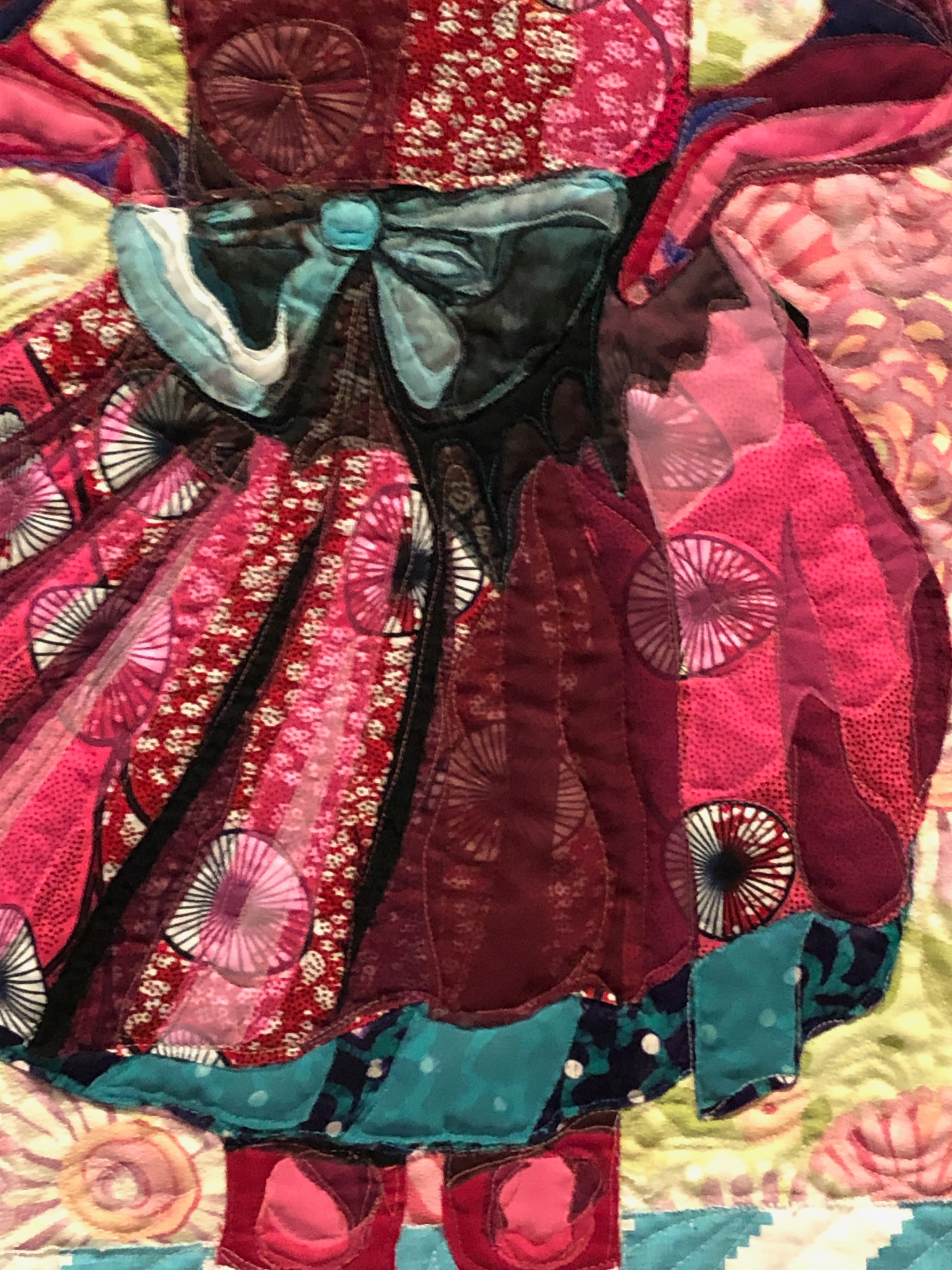Each child has a different color dress, pose, and facial expression. In addition to the impact of the quilt overall, the artist’s intricate use of her materials make the details as compelling to explore as the whole. This photograph shows part of the girl on the right; chiffon in bright and pale pinks and maroon creates highlights and shadows where it has been applied over the patterned fabric of the skirt. Every one of Butler’s quilts has thoughtfully chosen and applied fabrics, building complex imagery and meanings to celebrate the history of African-Americans in the United States. I hope I get a chance to see her work in person again.