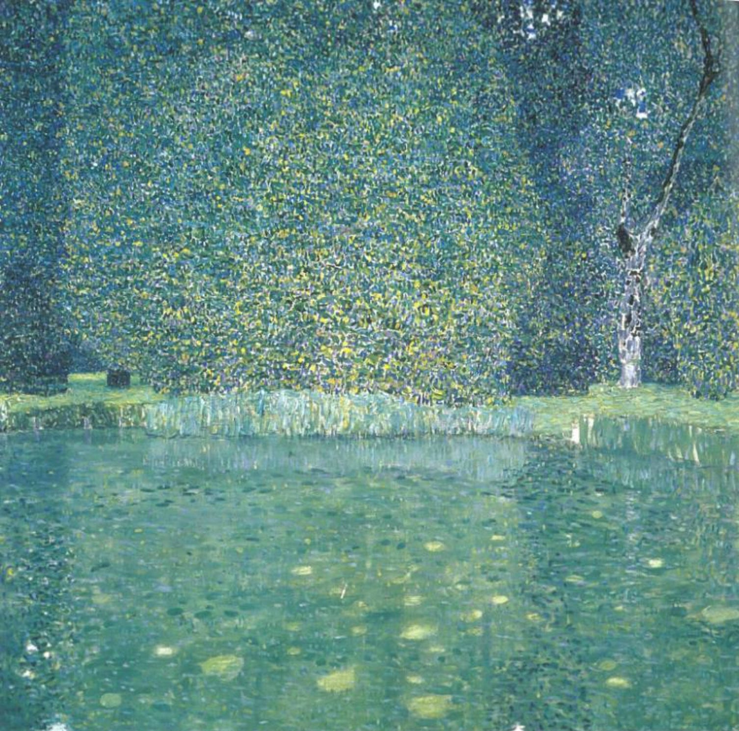 In general, Klimt’s facture was a mix of tight modeling for anatomical features, with looser brush marks for background elements. Many of his landscapes, meanwhile, thrummed with short strokes and daubs of color that echo the work of Georges Seurat.