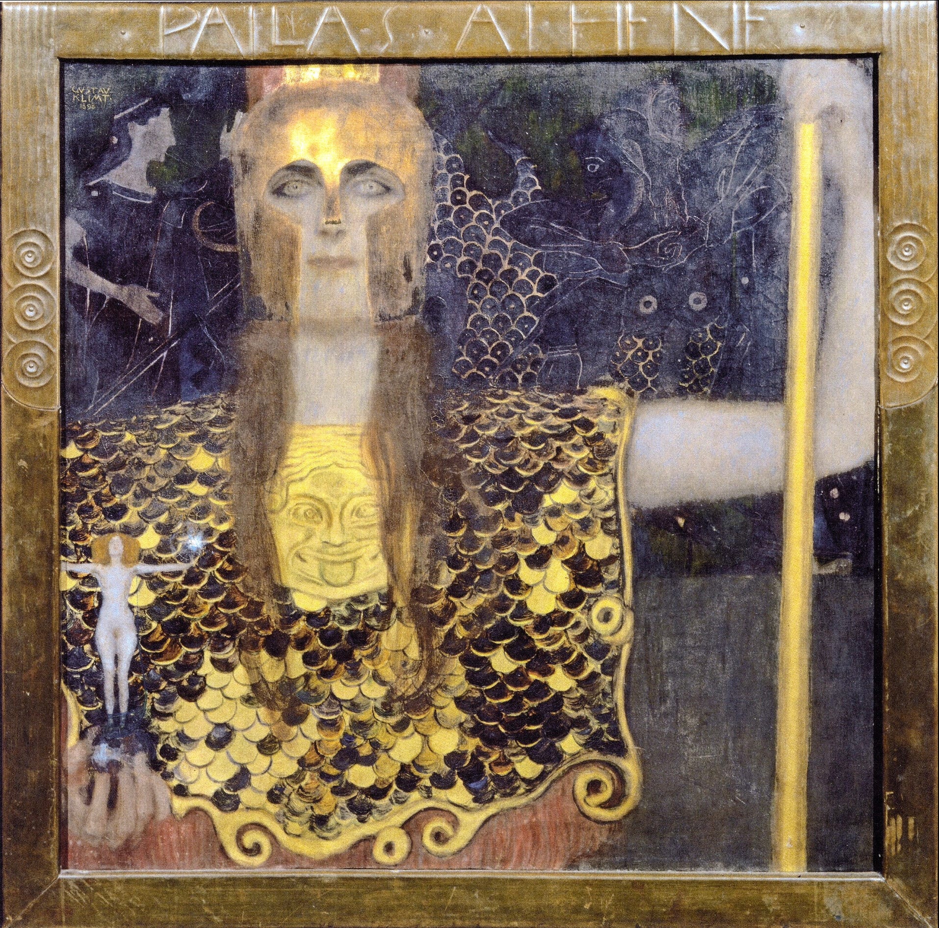 Gilding made an initial appearance in Pallas Athena (1898), an image of the ancient Greek goddess as an assertive female warrior wearing a helmet and a scaly breastplate enhanced with gold leaf. The intricacy of the latter evinced the emphasis on pattern that would become a hallmark of Klimt’s practice.