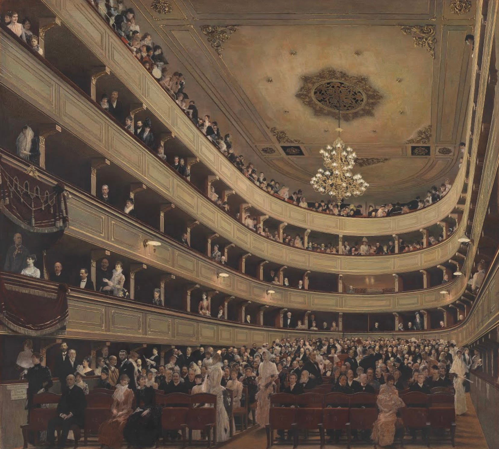 In 1880, Klimt and Ernst Jr. joined with another student, Franz Matsch, to start the Company of Artists, which received commissions to create large-scale decorative murals for various public buildings. Among them were Vienna’s Kunsthistorisches Museum; the Hermesvilla, a palace the emperor had built for his wife; and the Burgtheater, the capital’s principal performing venue. Klimt’s efforts earned him Austria’s highest artistic award, the Gold Cross of Merit, from Franz Josef in 1888.